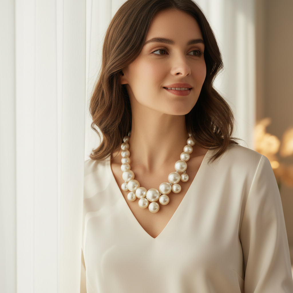 Strahlt mit klassischen, runden Perlen zeitlose Schönheit aus. Diese Kette passt zu verschiedenen Outfits.