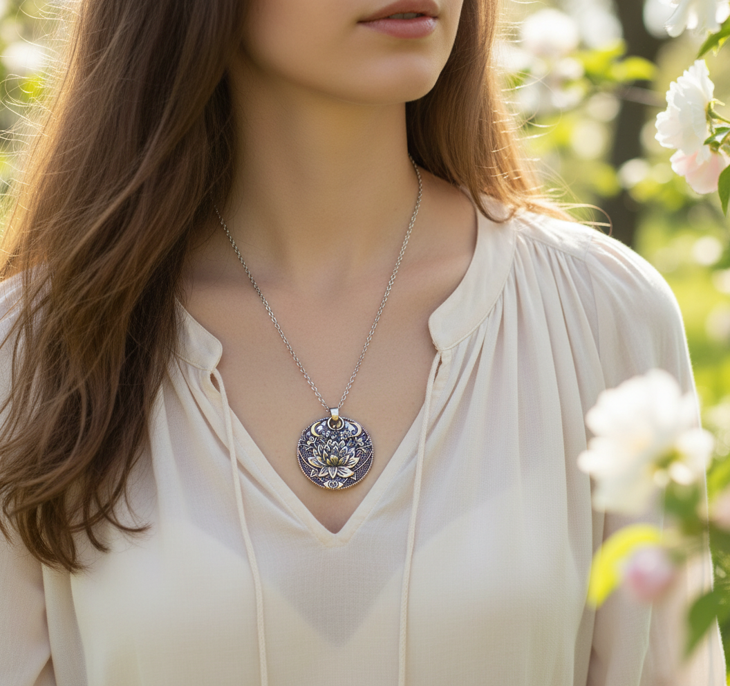 Suchen Sie nach einem Schmuckstück, das nicht nur Ihr Outfit vervollständigt, sondern auch eine bedeutungsvolle Botschaft vermittelt? Diese Halskette verkörpert Reinheit und Hoffnung, inspiriert von dem kraftvollen Symbol des Lotuses. Handgefertigt und exquisite verarbeitet, strahlt sie Eleganz und Stil aus. Sie ist perfekt für jeden Anlass, sei es ein kultivierter Abend oder ein alltägliches Treffen.