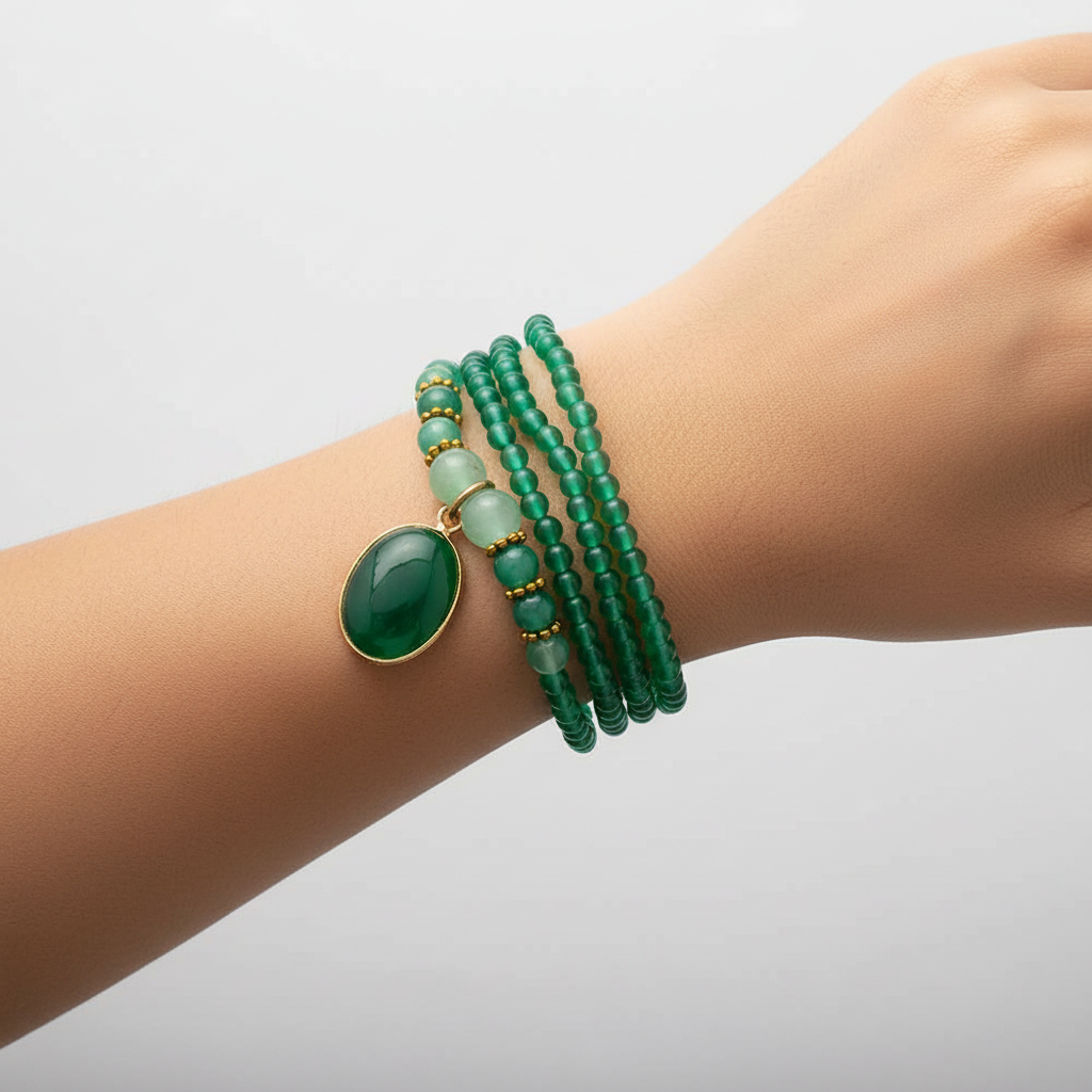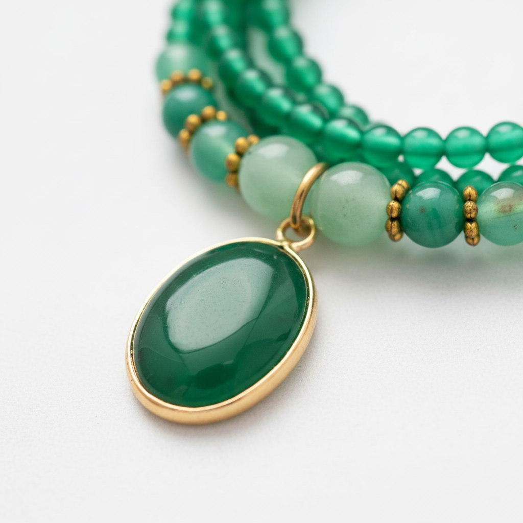 Der grüne Onyx hilft, Spannung abzubauen. Dadurch fühlst du dich entspannter und ausgeglichener.