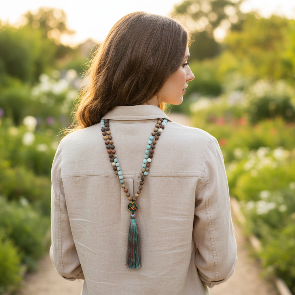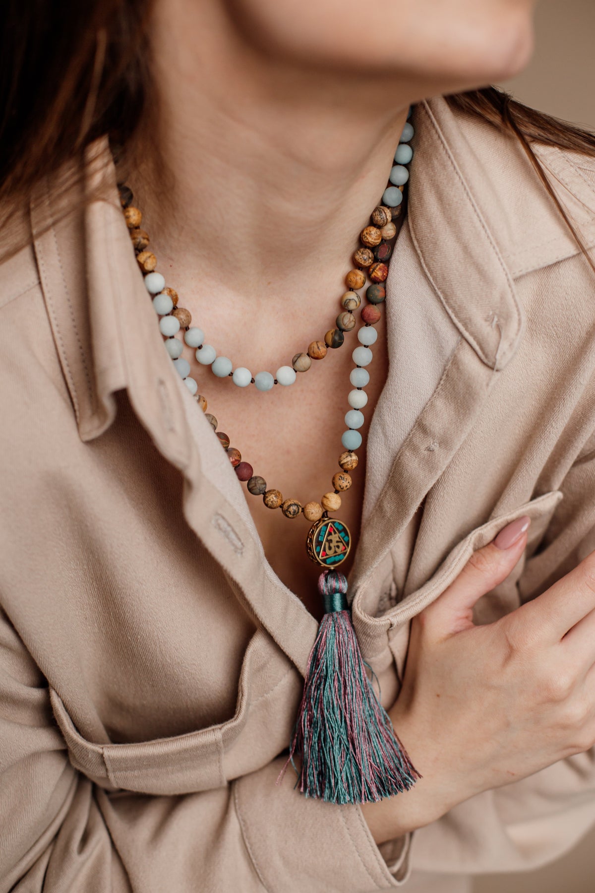In der Hektik des Alltags kann es schwerfallen, innere Ruhe zu finden. Diese Kette ist nicht nur ein wunderschönes Schmuckstück, sondern auch ein Werkzeug zur Vertiefung deiner Meditation. Gefertigt aus 108 natürlichen Kristallperlen, unterstützt sie dein spirituelles Wachstum. Die Kombination aus Amazonit und Picture-Jaspis schenkt dir emotionales Gleichgewicht und Erdung.
