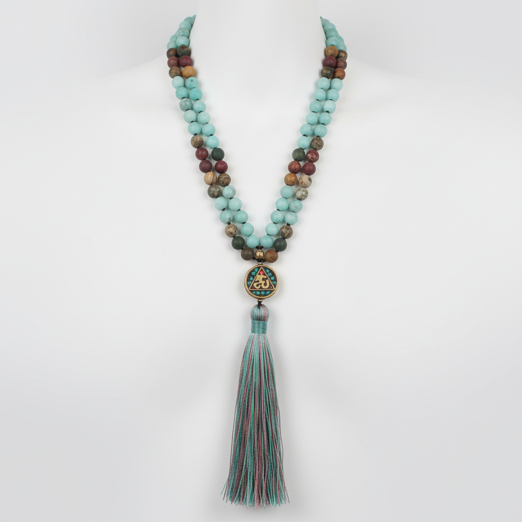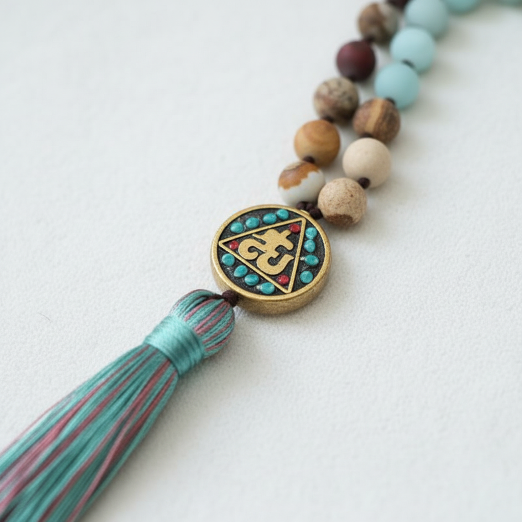 - Materialien: Amazonit, Picture-Jaspis, Guru-Perle mit Aum-Symbol