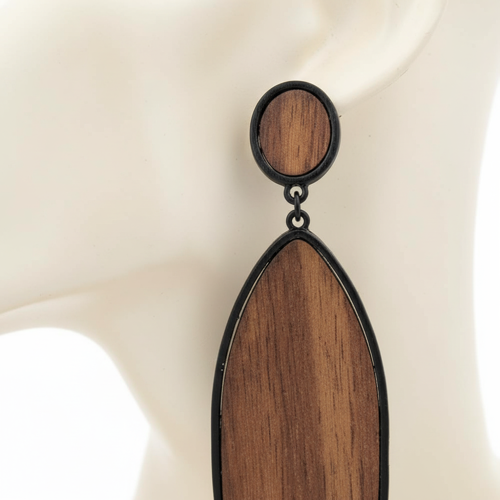 Diese Ohrringe bestehen aus langlebigem Holz und Metall. Sie sind sorgfältig verarbeitet für eine langanhaltende Freude.