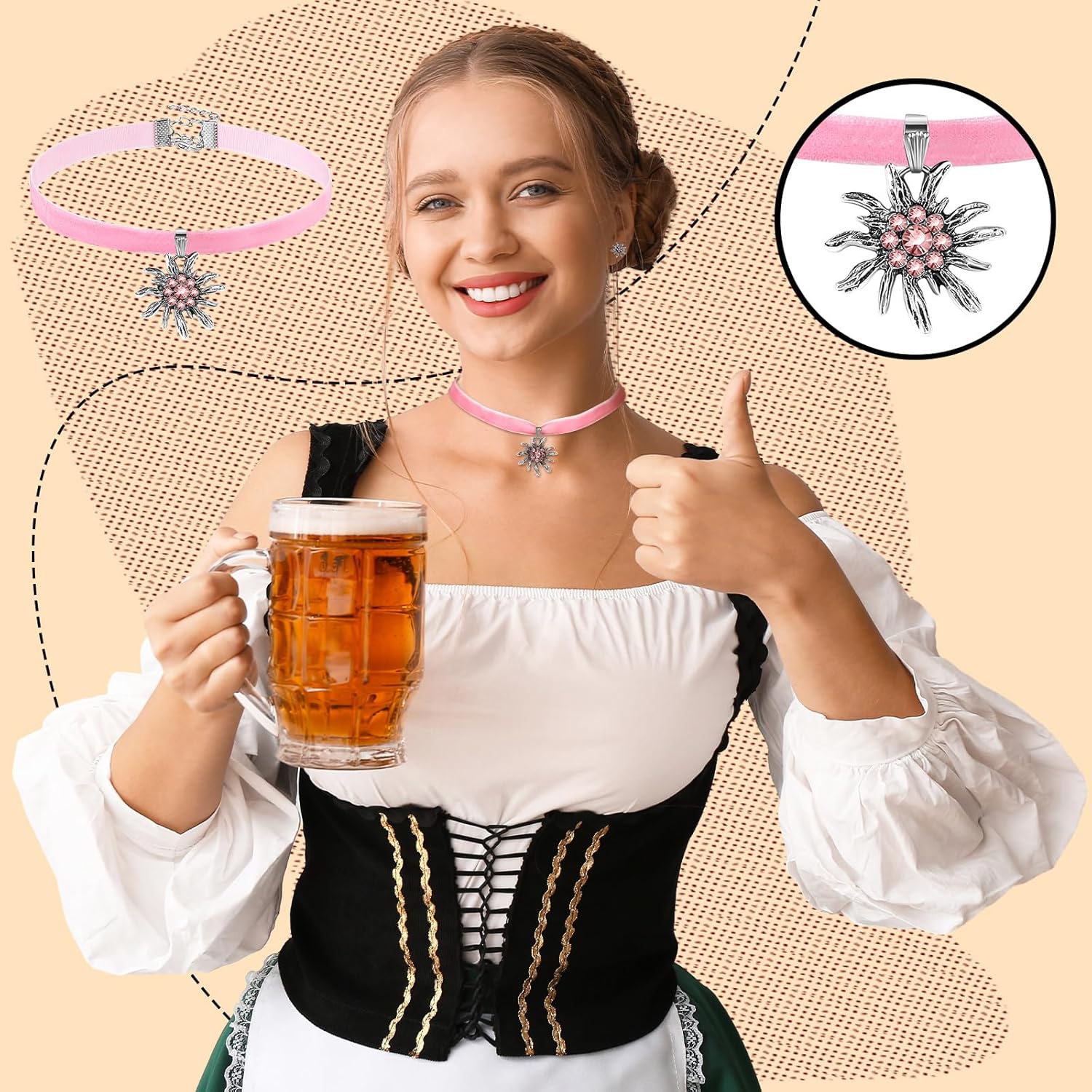 Das AlpenRosé Set kombiniert das klassische Edelweiß-Motiv mit einem zarten rosa Samtband und funkelnden Strasssteinen. Die Halskette mit Edelweiß-Anhänger und die passenden Ohrringe sind leicht zu tragen und passen ideal zu Dirndl, Bluse oder Lederhose. Mit seiner romantischen Farbgebung ist dieses Set ein Highlight für das Oktoberfest und festliche Anlässe.