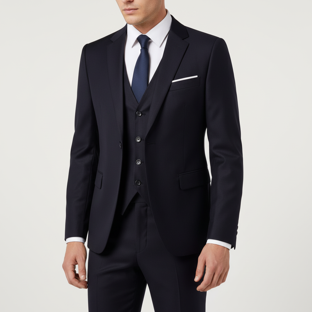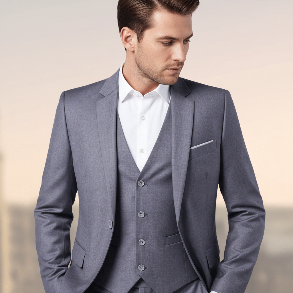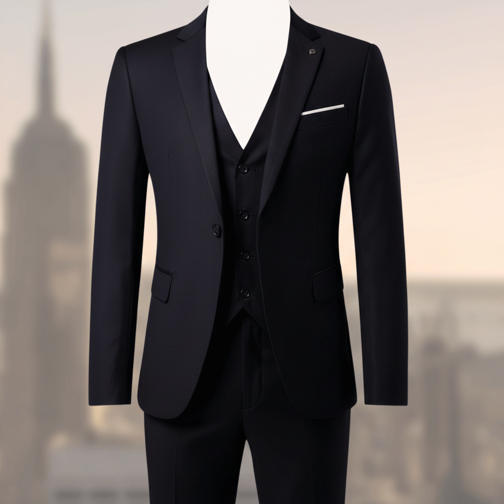 Der dreiteilige Anzug strahlt Eleganz aus. Er kombiniert moderne Schnitte mit traditionellem Stil.