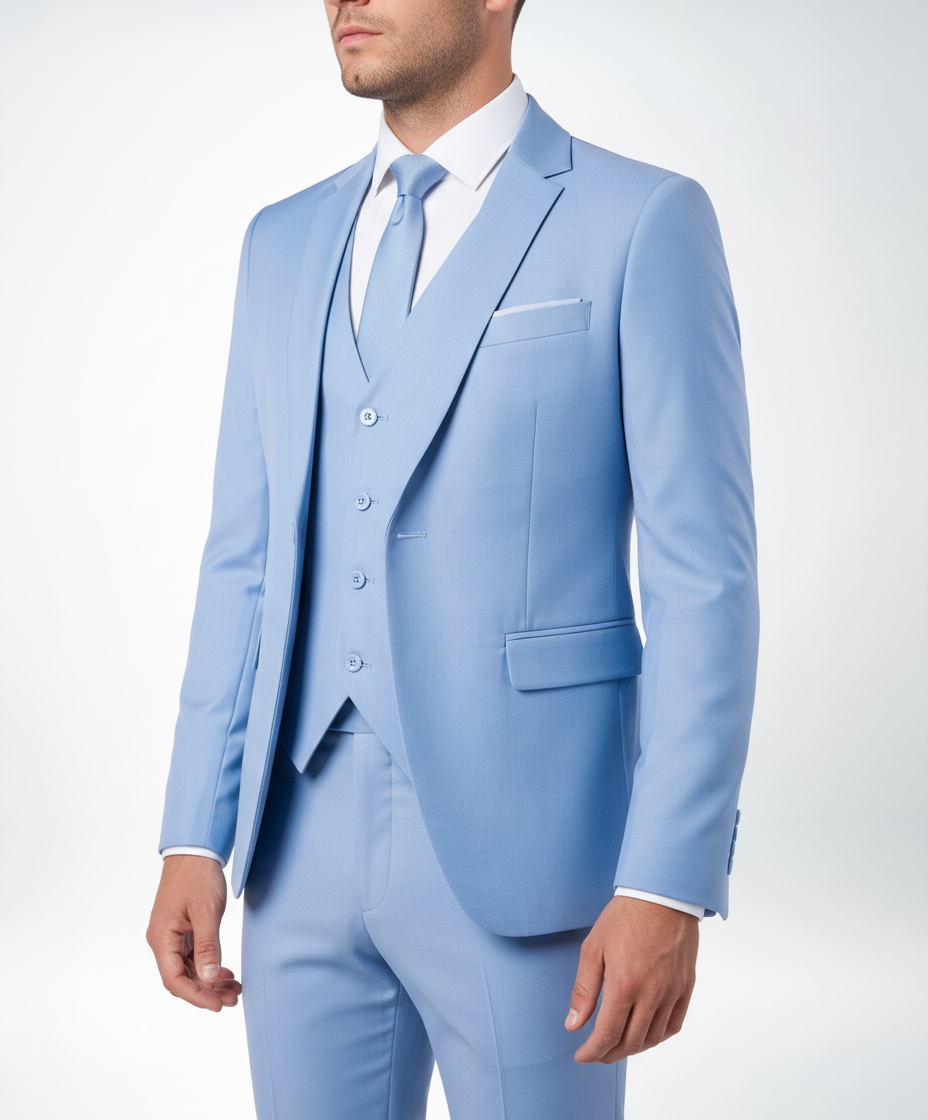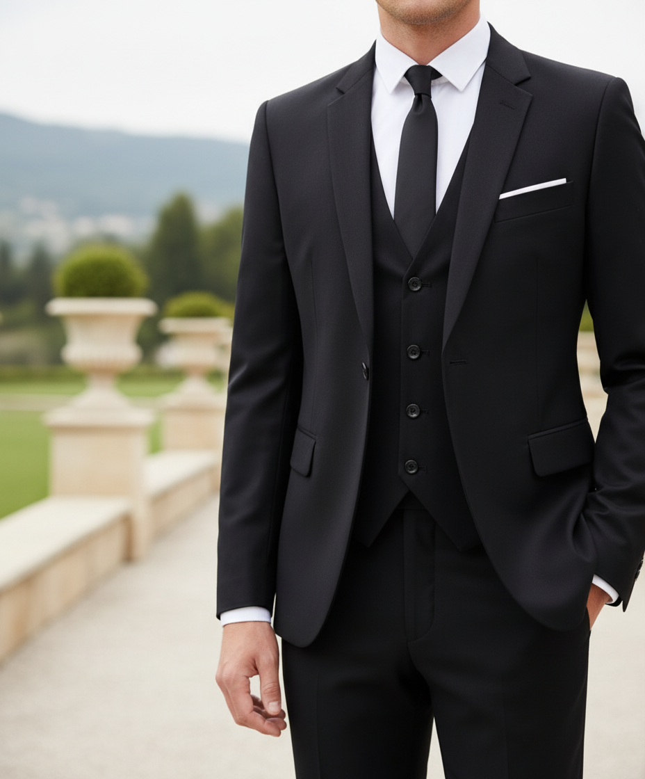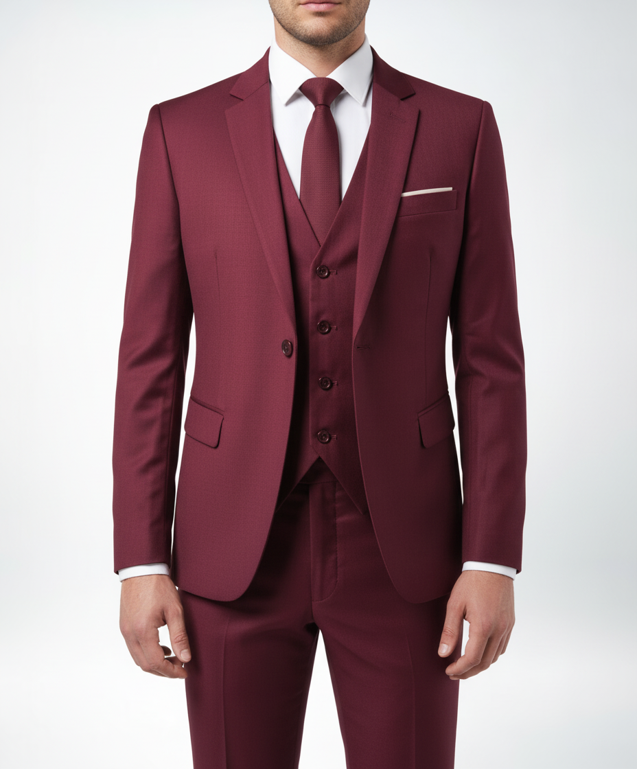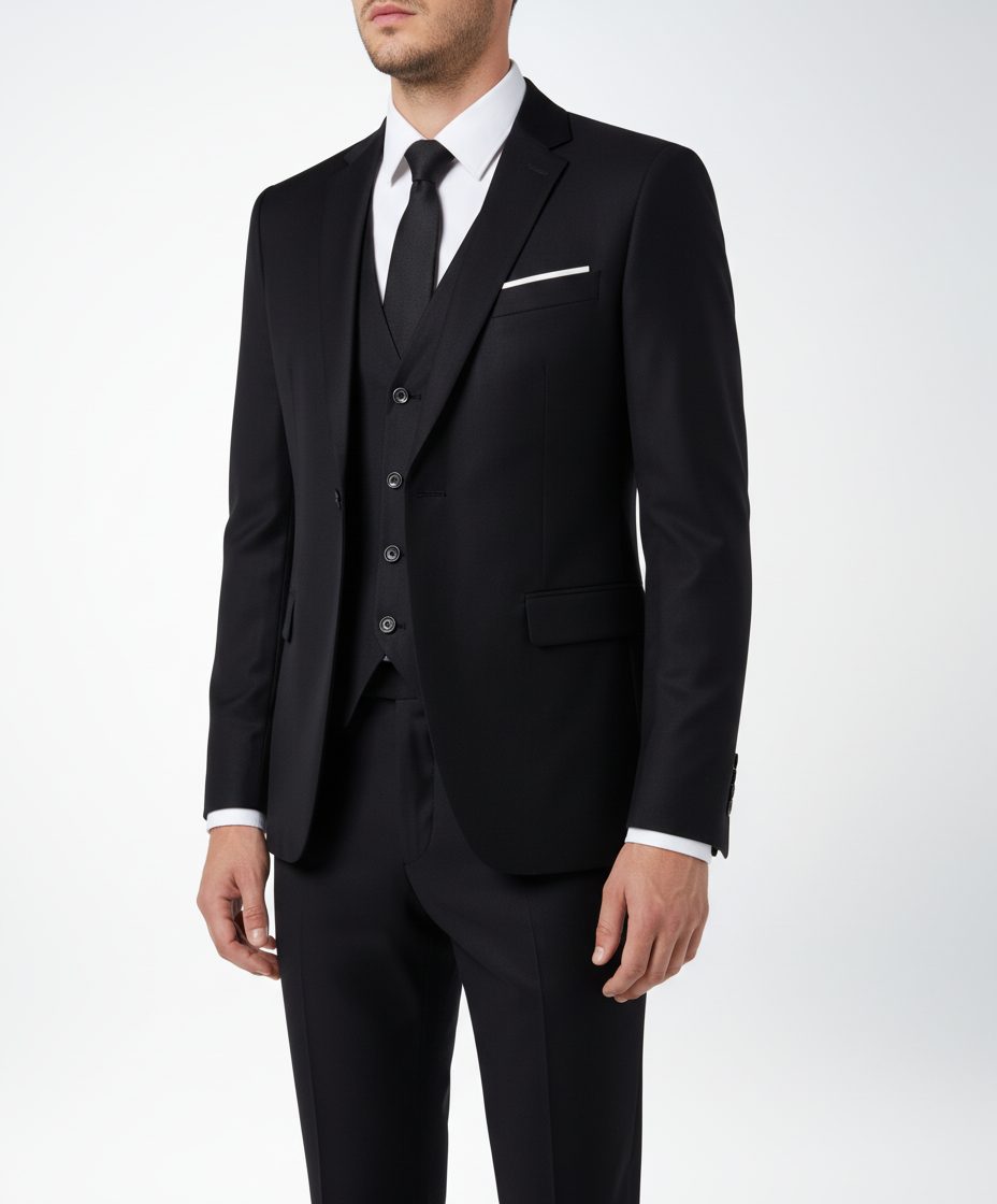 Der dreiteilige Anzug strahlt Eleganz aus. Er kombiniert moderne Schnitte mit traditionellem Stil.